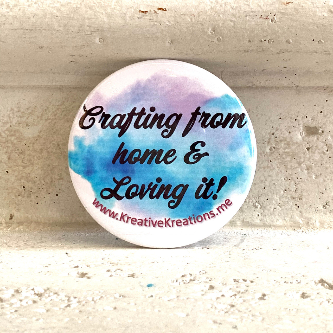 Impresionante fondo de acuarela azul con letras negras "¡Creando desde casa y amándolo!" Con pasador en la parte posterior para sujetarlo a su portaherramientas o cordón favorito.