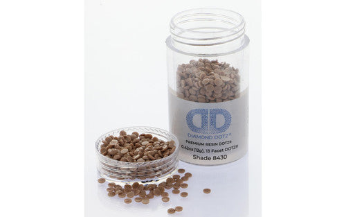 Scratch resistant resin dot gems have 13 facets for a diamond like effect.