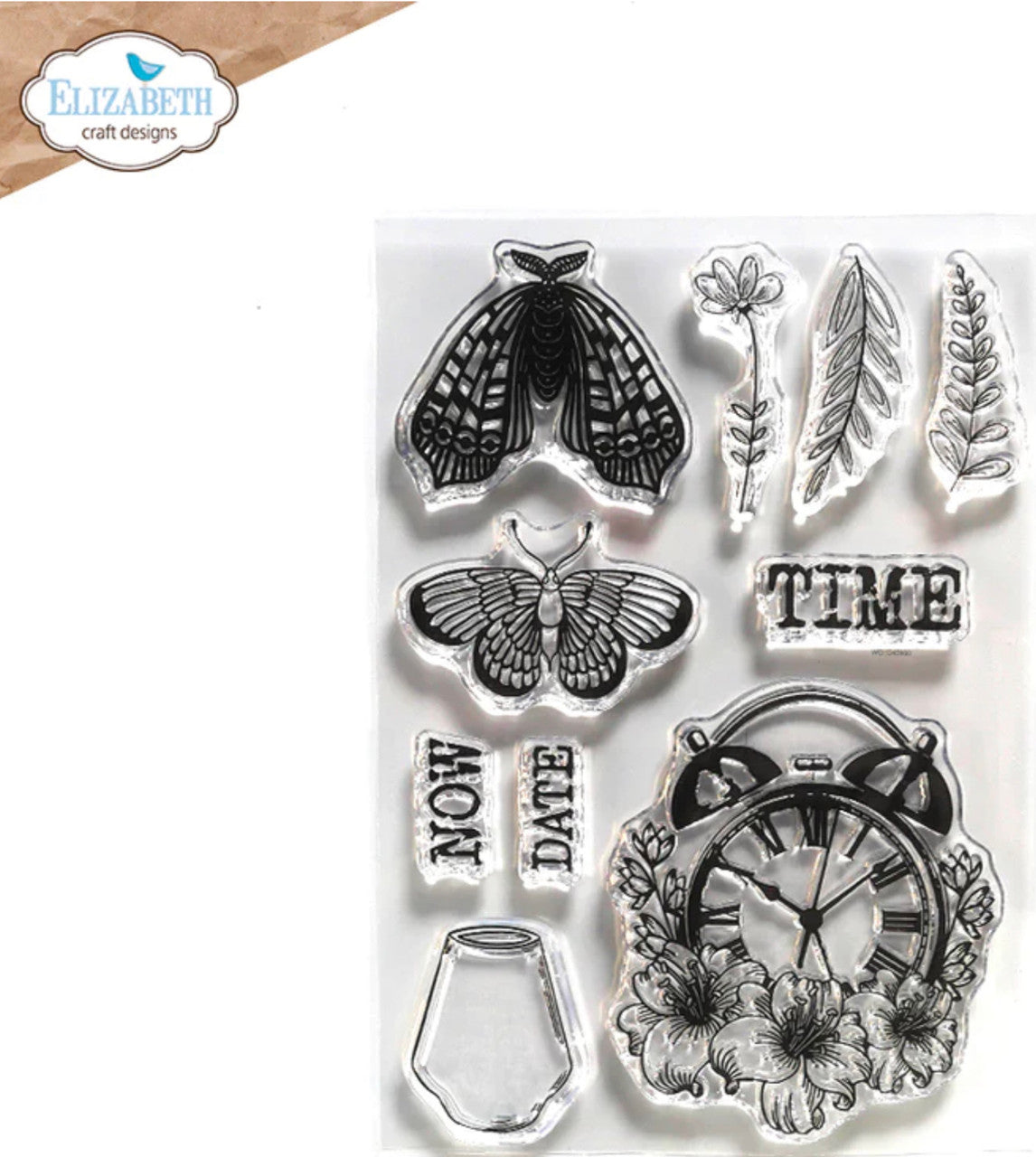 Deze 10-delige set met heldere fotopolymeerstempels, Back In Time, maakt deel uit van de Back In Time Collection van Elizabeth Craft Designs. Deze stempelset bevat twee vlinders/motten, een wilde bloem, twee stukjes blad, een vaas, een vintage wekker versierd met bloemen en de woorden NU, DATUM en TIJD. Deze stempels hechten op acrylblokken en kunnen worden gebruikt met je favoriete inkten, markers, embossingpoeders en andere knutselmedia (afzonderlijk verkrijgbaar). Deze stempels kunnen worden gebruikt op kaarten, plakboekpagina's, tags en andere papierknutselprojecten.