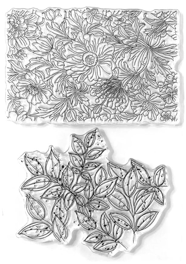 This versatile A5 (6” x 8” ) set includes two large floral-themed stamps. The largest stamp is approximately 3.5” x 5.5” (9 x14 cm)