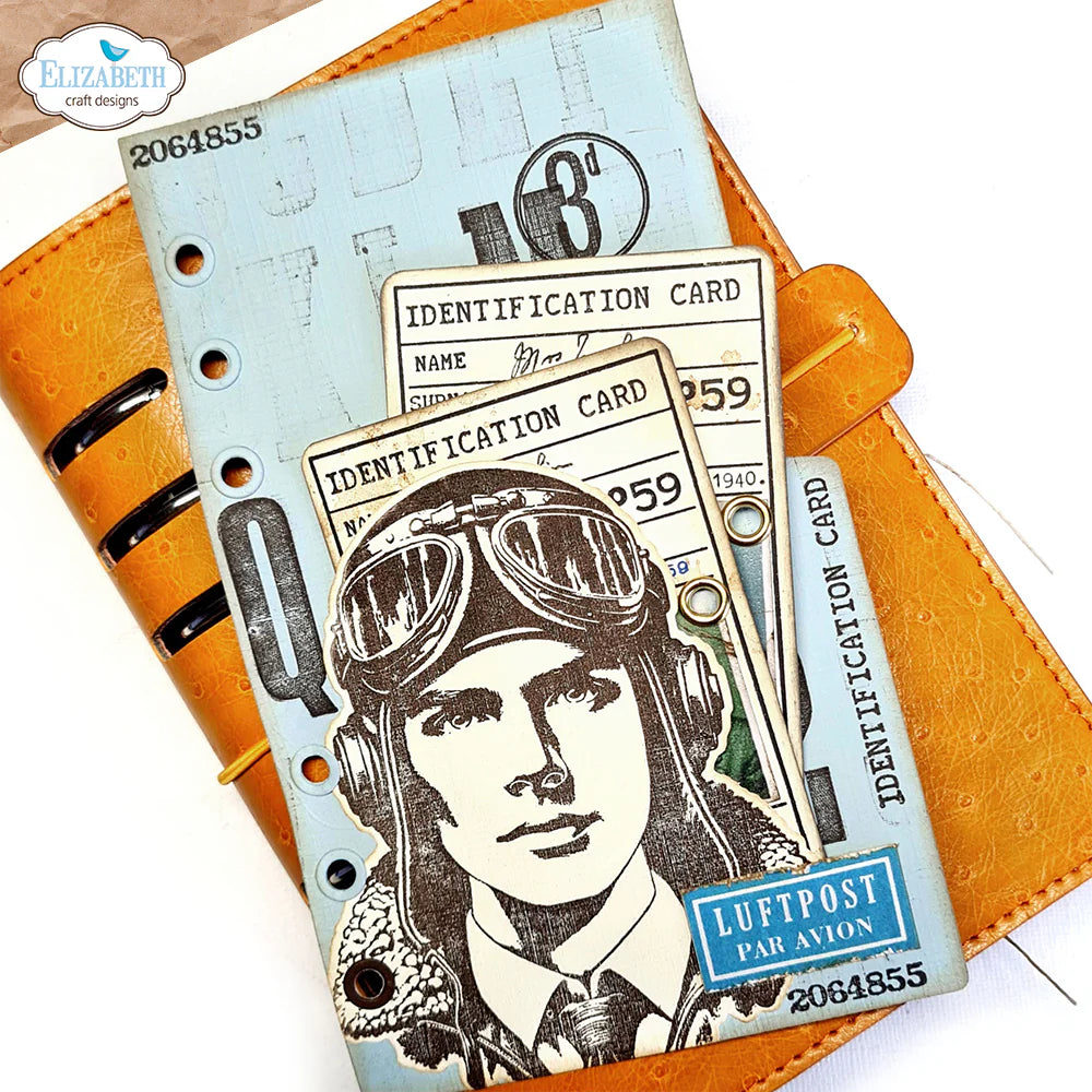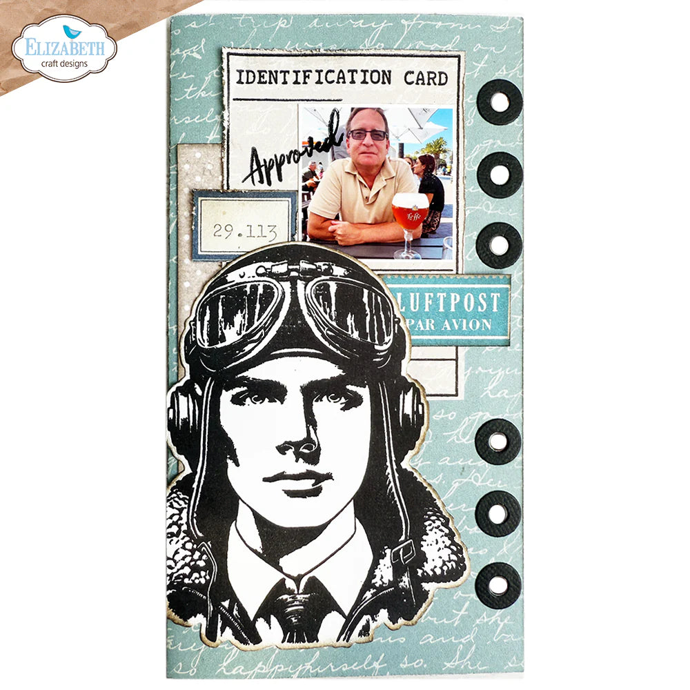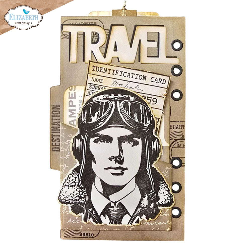 Designs include a masculine pilot with a coordinating die and various stamps that can be used to create travel documents and labels, including identification cards.