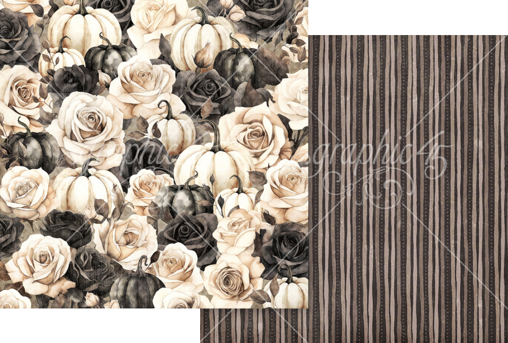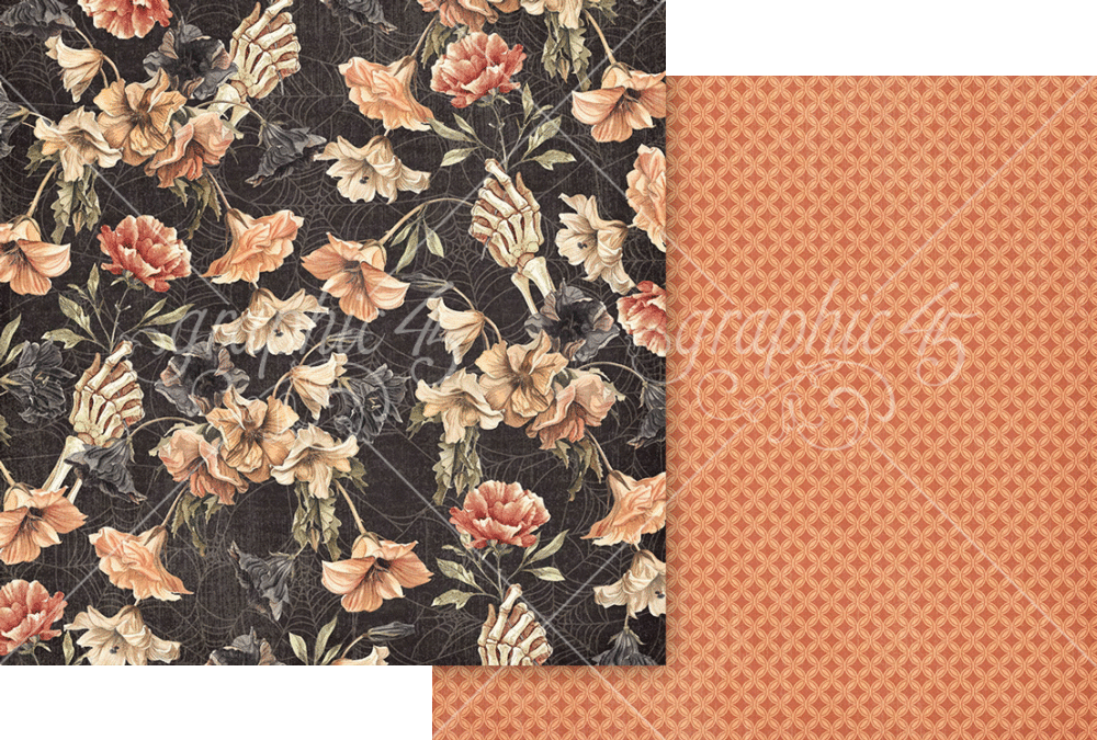 Enter a world of vintage Halloween charm with Graphic 45’s Ghostly Greetings Paper Collection. This spirited collection conjures up a dreamy Halloween garden filled with spooky ghosts, delicate spiderwebs, curious black bats, and graceful fall florals. Ivory and midnight pumpkins, weathered tombstones, and skeletal touches dance across a palette of dusty orange, soft cream, charcoal black, and antique blush.