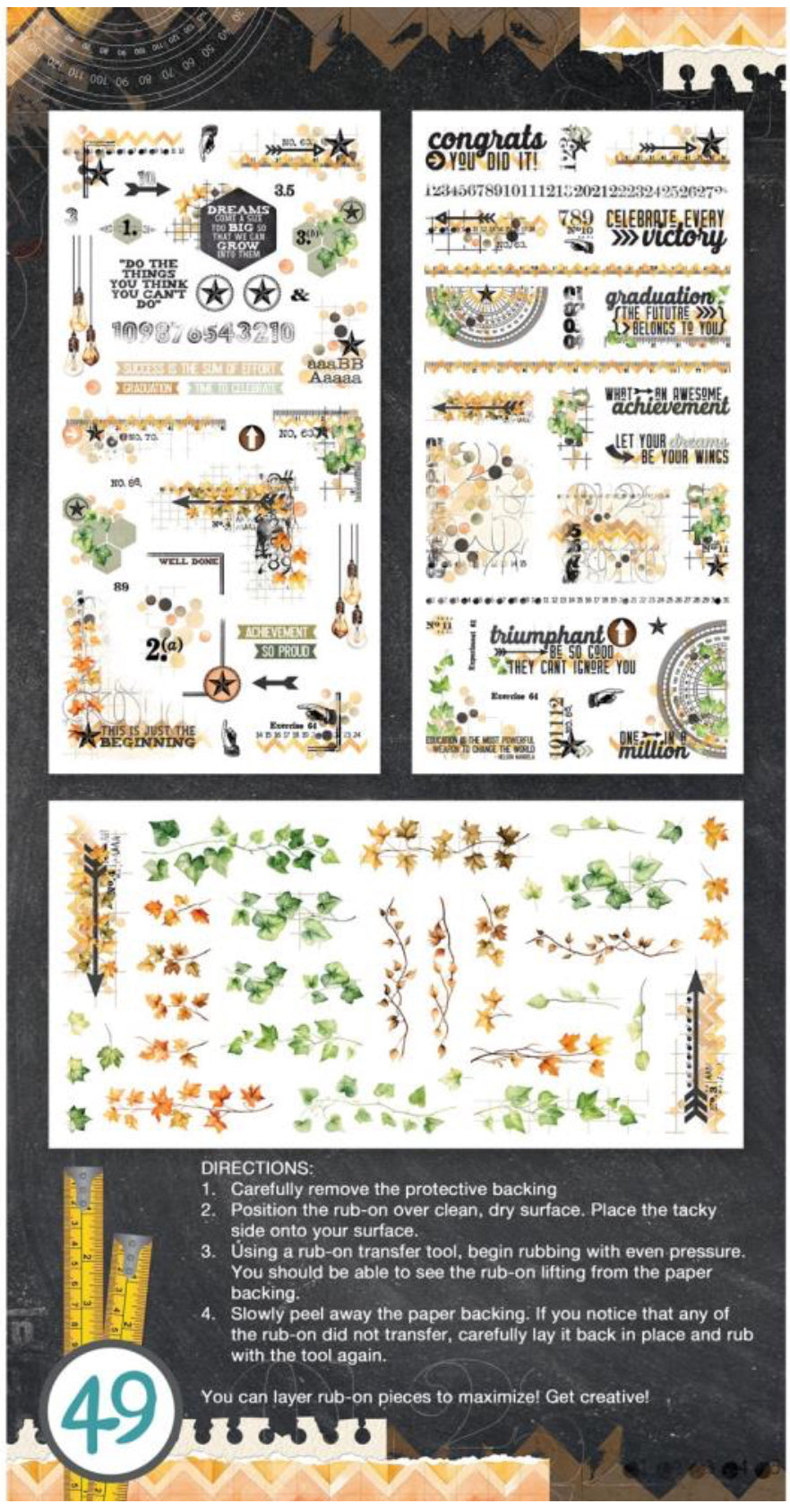 The various assortment of rub-on transfers in this set will enhance any project. Elements include quotes, corner clusters, vines, borders and more! Rub-on transfers can be applied to most clean, dry surfaces with little effort.