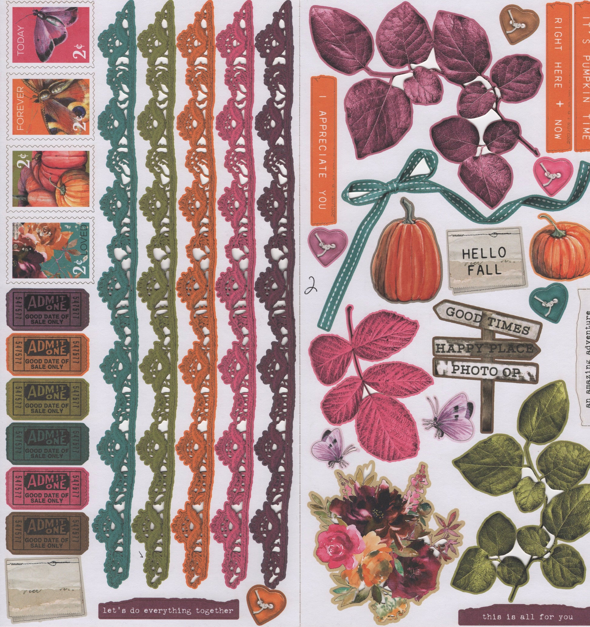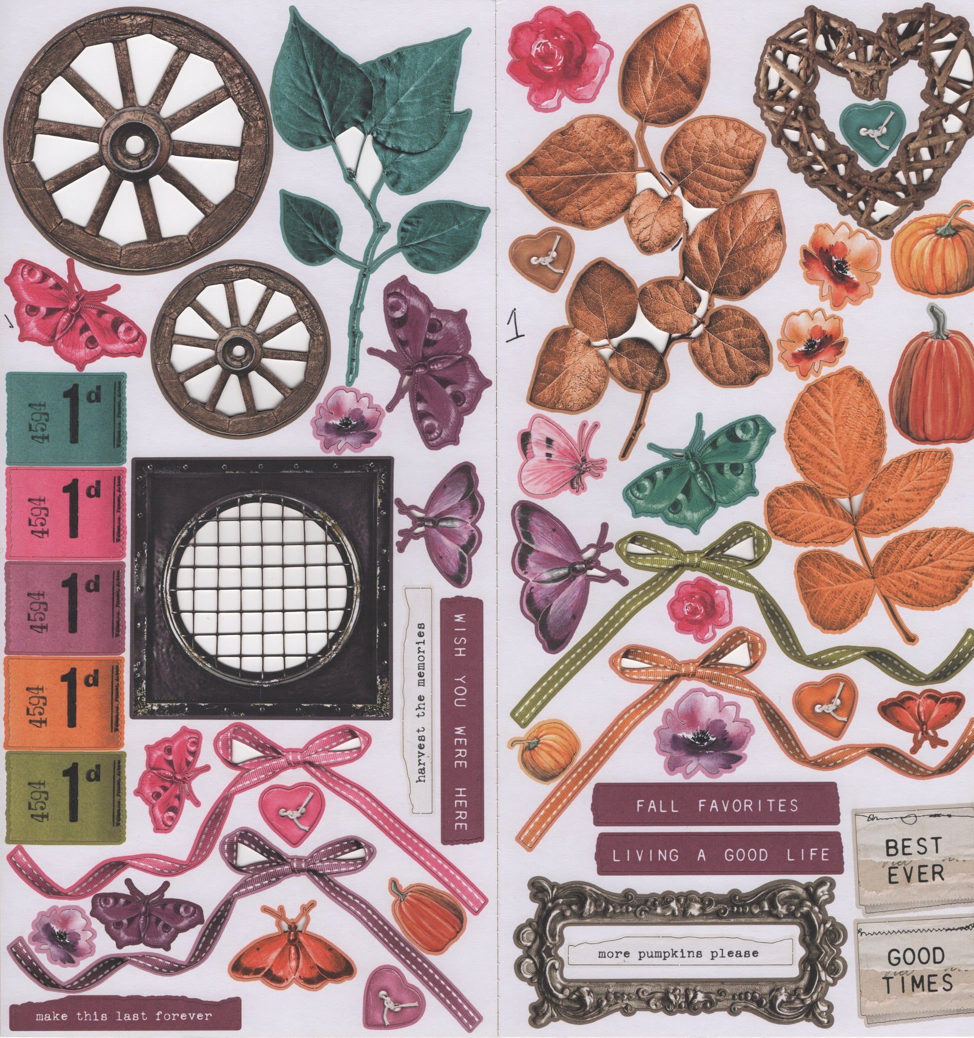 89 elements that include assorted leaves, tickets, butterflies, postage, buttons, pumpkins and more