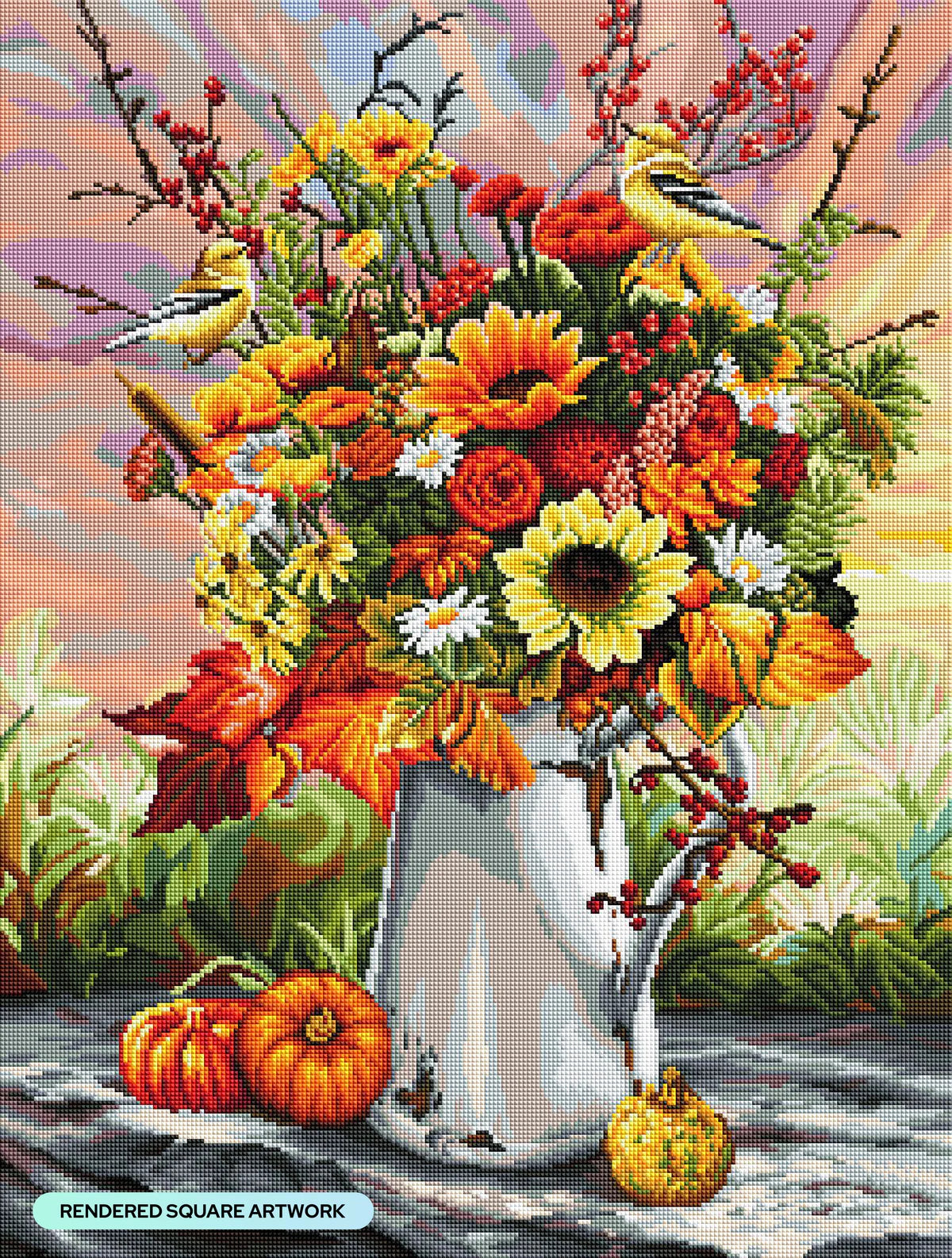 Brighten the mood with a pastoral bouquet bursting with fall colors. Topped off by two charming yellow birds, it sits radiantly in the sunlight.