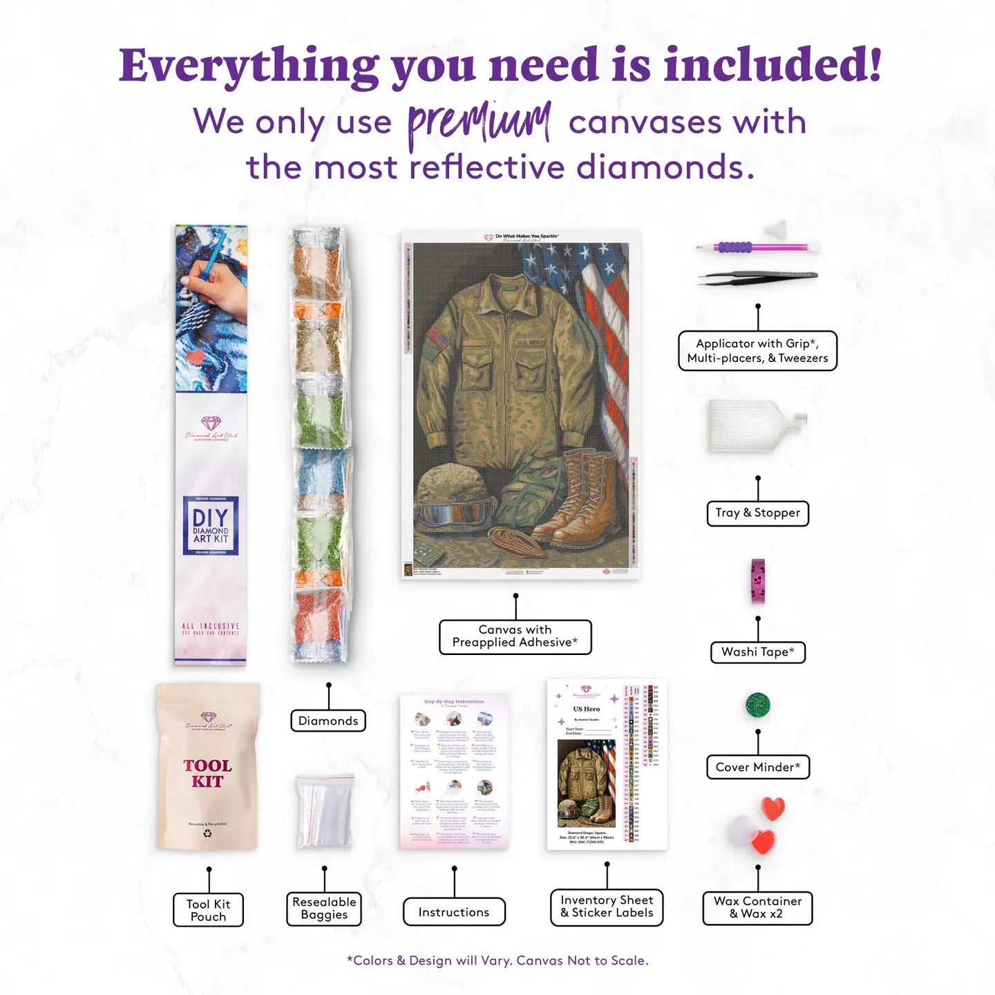 Canvas x 1, Diamonds, Tray x 1, Applicator + Grip x 1, Wax x 2