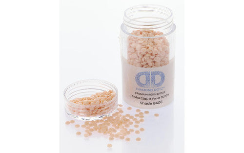 Scratch resistant resin dot gems have 13 facets for a diamond like effect.