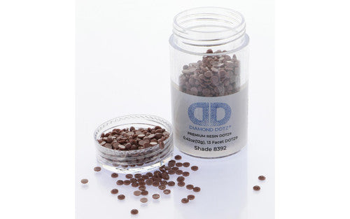 Scratch resistant resin dot gems have 13 facets for a diamond like effect.