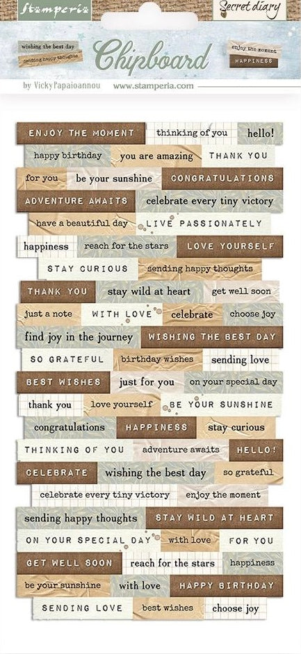 Adhesive printed cardboards embellishments. All the subjects are matching the paper pads. Chipboard sheet measures 6” x 12”.